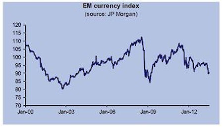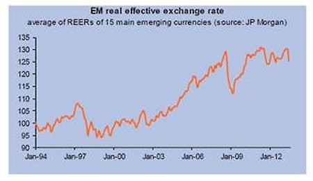 Betrachtet man die nominalen Wechselkurse, so mag es so aussehen, als habe in den vergangenen beiden Jahren eine kräftige Korrektur stattgefunden. Aber der reale effektive Wechselkurs der Schwellenländerwährungen, der letztendlich entscheidend ist, weil er die Inflationsdifferenz gegenüber der restlichen Welt berücksichtigt, hat bisher kaum abgewertet. Von 2002 bis 2011 werteten die Schwellenländerwährungen real effektiv um 31% auf. Und seit dem Höchststand vom vergangenen März hat lediglich eine Abwertung um 4% stattgefunden.
