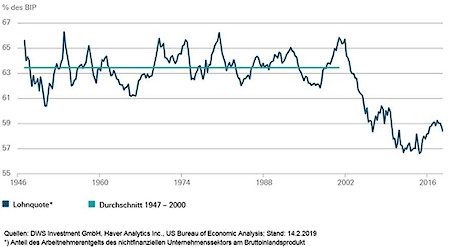 In den USA blieb die Aufteilung zwischen den Einkommen der Produktionsfaktoren Arbeit und Kapital in der zweiten Hälfte des 20. Jahrhunderts weitgehend konstant. Das bedeutet gemäss Josh Feinman, US-Chief Economist bei DWS, dass die Produktivität und die reale Arbeitsvergütung pro geleisteter Arbeitsstunde (Nominalkompensation, adjustiert um den zur Berechnung der Produktivität verwendeten Deflator) im Durchschnitt mit der gleichen Rate gewachsen sind.