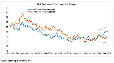 "Anfang Jahr löste eine sich verflachende Zinskurve Spekulationen aus, dass sie sich am Ende tatsächlich invertieren könnte - eines der zuverlässigsten Marktsignale, dass eine Rezession 12 bis 18 Monate entfernt sein könnte", stellt Edi Aumiller, Country Head Switzerland bei Legg Mason, fest. Die Inversion trat jedoch nicht ein. Stattdessen kehrte sich der Trend leicht um, wobei die Renditen für die 30-jährigen Anleihen in den letzten Wochen ohne viel Aufsehen stiegen. Dies, so Aumüller, vielleicht aufgrund des rosigen Konjunkturszenarios, welches die Federal Reserve bei der jüngsten Zinserhöhung gezeichnet hatte. Alles in allem sei dies der Grund für den Rückgang der Inflationserwartungen in den letzten Wochen gewesen. Eine weltweit beachtete fünfjährige Break-even-Inflationsrate erreichte beispielsweise am 1. November 2018 nur noch einen Wert von 1,87%.