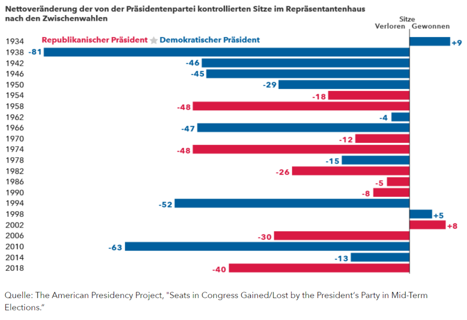 Für Investoren wäre das das Ende jeder Chance auf eine ehrgeizige demokratische Gesetzgebung in den nächsten zwei Jahren. Da der Verlust von Sitzen so häufig vorkommt, sei er in der Regel schon früh im Jahr in den Märkten eingepreist. Aber das Ausmass einer politischen Machtverschiebung – und die daraus resultierenden politischen Auswirkungen – blieben bis zum Ende des Jahres unklar.