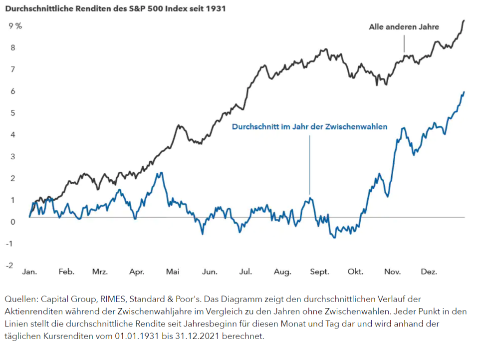 Capital Groups Analyse der Renditen des S&P 500 Index seit 1931 hat gezeigt, dass sich der Kursverlauf von Aktien in Zwischenwahljahren deutlich von dem anderer Jahre unterscheidet. Aktien wiesen in den ersten Monaten eines Jahres mit Zwischenwahlen tendenziell niedrigere Durchschnittsrenditen auf und konnten oft bis kurz vor der Wahl kaum an Boden gewinnen.