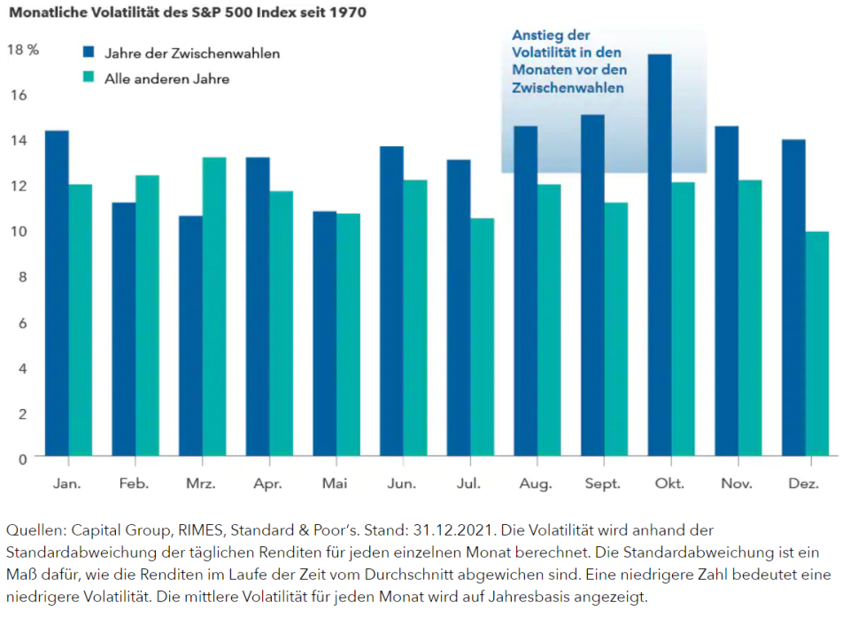 Aufmerksamkeit auf Probleme des Landes, negative Kampagnenbotschaften und unklare politische Vorschläge – Wahlen können sehr nervenaufreibend sein. Es sei daher nicht überraschend, dass die Marktvolatilität in Zwischenwahljahren höher sei, insbesondere in den Wochen vor dem Wahltag. Seit 1970 hat die durchschnittliche Standardabweichung der Renditen in Zwischenwahljahren bei fast 16% gelegen, verglichen mit 13% in allen anderen Jahren.