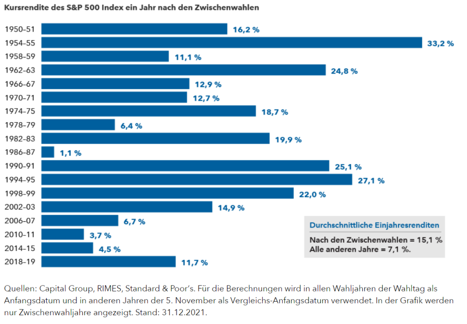 Der Silberstreif am Horizont für Anleger sei, dass sich die Märkte in den Folgemonaten in der Regel kräftig erholen würden. Ausserdem sei die Rallye, die oft kurz vor dem Wahltag einsetze, nicht nur eine kurzfristige Erscheinung. "Überdurchschnittliche Renditen sind typisch für das gesamte Jahr nach dem Wahlzyklus", so Miller. Seit 1950 hat die durchschnittliche Einjahresrendite nach einer Zwischenwahl bei 15% gelegen. Das ist mehr als das Doppelte der Rendite aller anderen Jahre in einem ähnlichen Zeitraum.