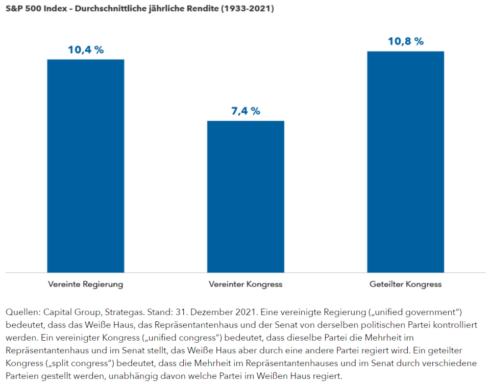 Seit 1933 hatten die Märkte in allen Jahren, in denen eine einzige Partei das Weisse Haus und beide Kammern des Kongresses kontrollierte, im Durchschnitt zweistellige Renditen erzielt. Das liegt nur knapp unter den durchschnittlichen Gewinnen in Jahren mit einem gespaltenen Kongress, ein Szenario, das viele in diesem Jahr für sehr wahrscheinlich halten. Selbst wenn die gegnerische Partei des Präsidenten den Kongress kontrolliert hat, wurde eine solide durchschnittliche Kursrendite von 7,4% erzielt.