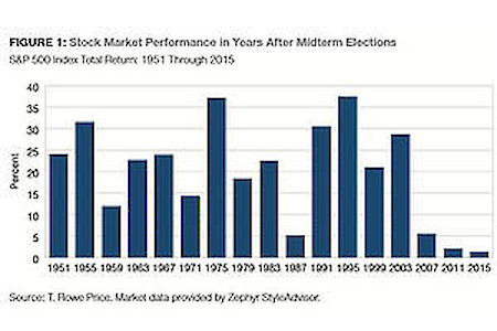 Laut T. Rowe Price haben selbst politische Umbrüche in der Regel nicht zu Marktverwerfungen geführt: In den Halbzeitwahlen 1954, 1994 und 2006 verlor die Partei des amtierenden Präsidenten ihre Mehrheit sowohl im Repräsentantenhaus als auch im Senat. Im Jahr nach diesen Wahlen legte der S&P 500 Index um 31,5, 37,4 bzw. 5,5 Prozent zu.