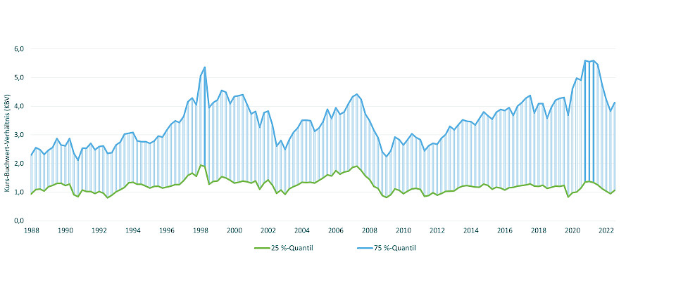 Quelle: Refinitiv Datastream, 31. Dezember 2022. Hervorgehobene Balken zeigen Zeiträume an, in denen das Kurs-Buchwert-Verhältnis unterschiedlicher war als gegenwärtig.