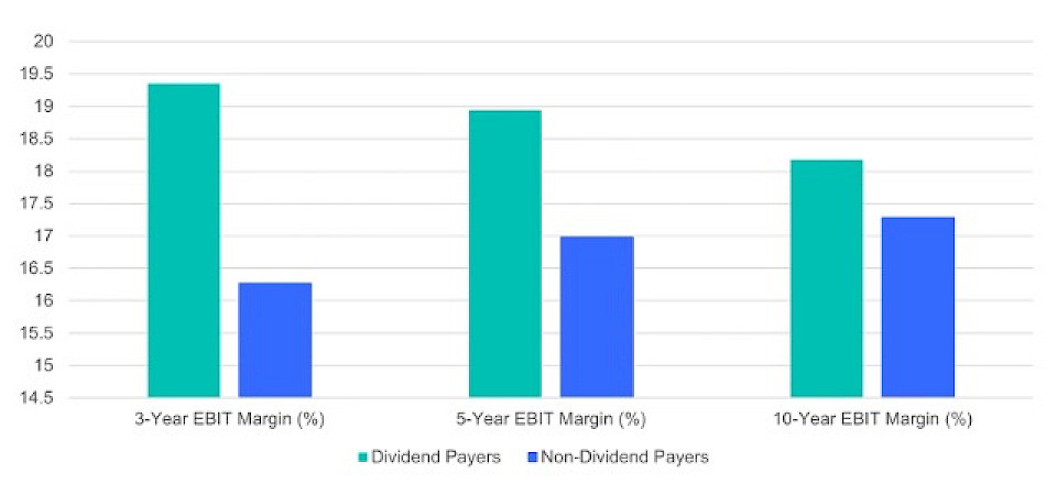 Da Anleger Dividenden in der Regel als fortlaufende Verpflichtung betrachten, erfordern Dividendenzahlungen ein gewisses Mass an Rentabilität, Rendite und Konsistenz der Cashflow-Generierung. Dies macht sie zu einer aussagekräftigen Kennzahl zur Bewertung der Unternehmensqualität. Unternehmen, die ihre Dividendenzahlungen im Laufe der Zeit konsequent erhöhen, zeigen, dass ihr Geschäft stetig Gewinne erwirtschaftet und bei Markt- oder Konjunkturabschwüngen widerstandsfähiger sein können. Die folgende Grafik zeigt, dass die Dividendenzahler im S&P 500 Index in der Vergangenheit profitabler waren als ihre nicht dividendenzahlenden Konkurrenten.