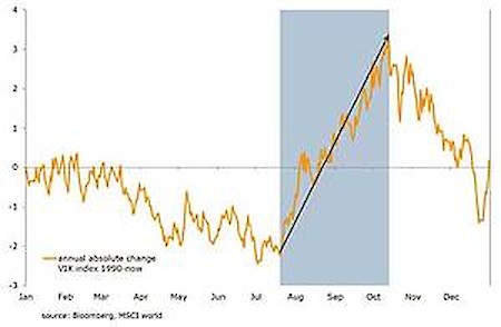 Der VIX, der die implizite Volatilität für Aktienoptionen zeigt, ist ein guter Massstab für die zugrunde liegende Volatilität im amerikanischen Aktienmarkt. August bis Oktober ist laut der annualisierten Grösse immer die aufreibenste Zeit des Jahres. Der Aktiencrash 1987 war im Oktober, 9/11 passierte im September 2011 und die schlimmste Baisse der Finanzkrise fiel auf den September 2008. Im Durchschnitt ist seit 1990 der VIX in diesen vier Monaten um 5 Punkte angestiegen.