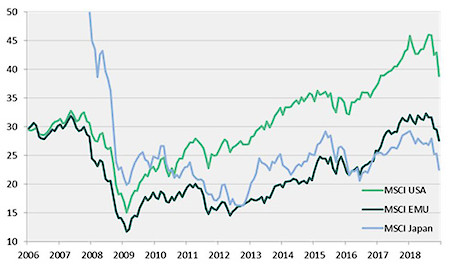 In allen drei betrachteten Regionen Europa, USA und Japan kippte die Kennzahl nach dem abrupten Einbruch des Marktes im letzten Quartal 2018. Bei relativer Betrachtung sind die Bewertungen in den USA immer noch höher als jene in der Eurozone und Japan. Gemessen an ihrer eigenen historischen Entwicklung sind die USA ebenso wie die Eurozone (26% bzw. 23% über ihrem Durchschnitt) weiterhin recht teuer. Allerdings hat auch die CAPE-Kennzahl ihr Manko, wie die Experten erklären. Denn sie würde im nächsten Jahr automatisch leicht zurückgehen, weil die schlechten Gewinn-Ergebnisse von 2009 aus dem zehnjährigen Zeitfenster herausfallen. Vor diesem Hintergrund würden die Gewinnerwartungen für die kommenden Jahre in einem Umfeld schwächeren Wachstums übermässig optimistisch erscheinen.
