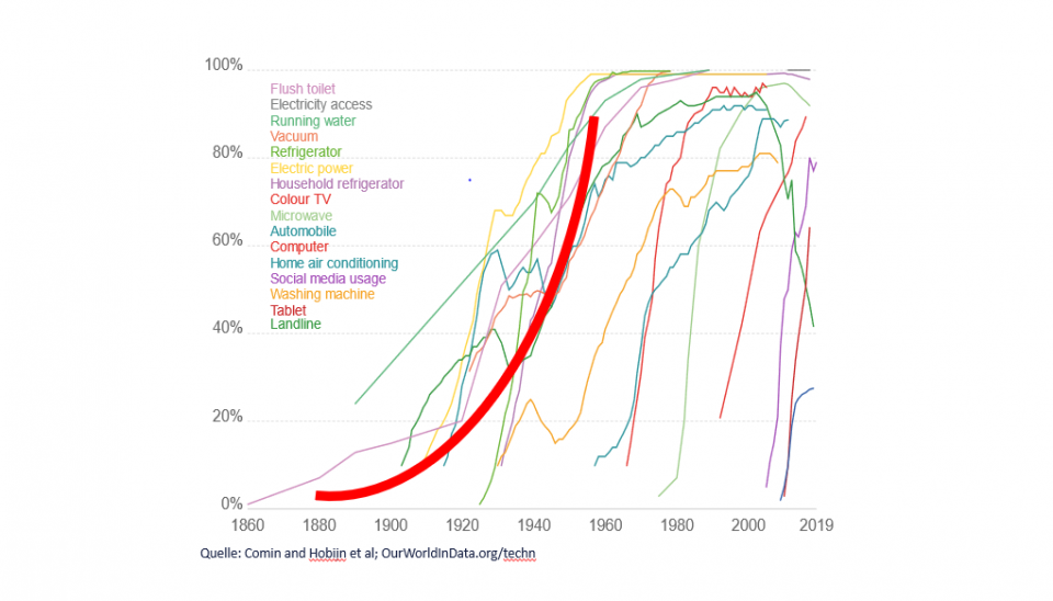 Ein flüchtiger Blick durch die Geschichte bietet interessante Perspektiven und Einblicke, wie sich innovative Technologien im Kontext ihrer Zeit verhalten haben. In der folgenden Abbildung sehen wir, wie innovative Technologien, die ihre Lebens- und Marktfähigkeit langfristig bewiesen haben, exponentiell gewachsen sind – trotz zweier Kriege, einer Depression und mehrerer Finanzkrisen und Epidemien. "Noch wichtiger ist, dass innovative Technologien in der Krise besonders schnell wachsen", meint Hung.