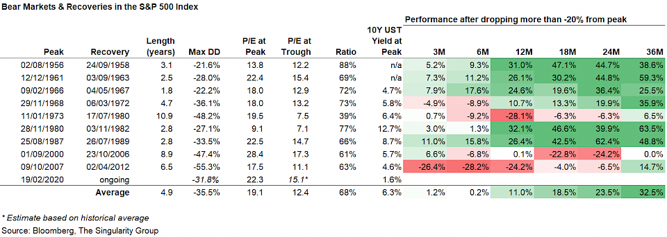 "Volatilität ist so alt wie der Kapitalismus selbst, ebenso wie die Buffett’sche Weisheit, dass Aktien langfristig immer positive Renditen abwerfen", betont der CIO und fährt fort: "Wenn wir auf mehr als 60 Jahre Börsengeschichte zurückblicken, haben wir zehn Bärenmarktepisoden im S&P 500 erlebt, einschliesslich der aktuellen, in der die Aktien um mehr als -20% gegenüber ihrem vorherigen Höchststand gesunken sind. Der durchschnittliche Rückgang während dieser Perioden betrug -35,5%. Wichtiger noch, wenn wir die Anlageperformance ab dem Zeitpunkt betrachten, als der Markt einen Verlust von -20% überstieg, stellen wir fest, dass Anleger, die zu diesem Zeitpunkt in den Markt eintraten, im Durchschnitt in den folgenden 3, 6, 12, 18, 24 und 36 Monaten eine positive Performance erzielten."