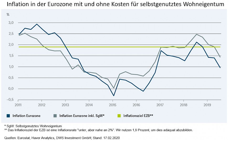 Steigende Löhne im Dienstleistungssektor dürften die Inflation der Eurozone etwas beflügeln. Zudem würde es laut DWS Sinn machen, wenn die Kosten für selbstgenutztes Wohneigentum in den Preisindex aufgenommen würden, wie der Chart der Woche aufzeigt.