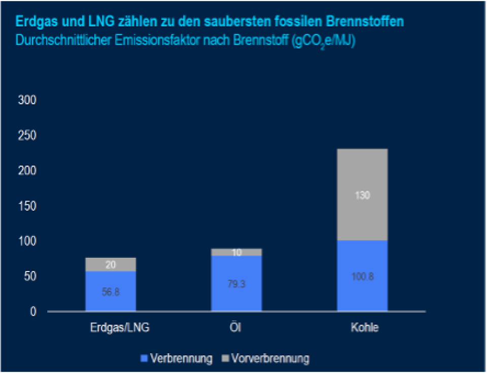 Quelle: The impact of decarbonization on the gas and LNG industry, McKinsey & Company, Juni 2021. Gramm CO2-Äquivalent je Megajoule. Die Werte zur Vorverbrennung sind Schätzungen auf Basis der gewichteten durchschnittlichen Treibhausgasemissionen. Auf Basis von Studien zu Natur und Nachhaltigkeit sowie Studien der britischen Regierung und des US-Energieministeriums.