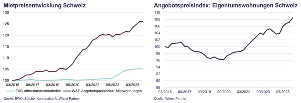 Die anhaltende Verknappung des Angebots hat die Preise über Jahre deutlich steigen lassen. Sowohl die Transaktionspreise für Wohneigentum als auch die Mietpreise zeigen klar nach oben. Der temporäre Zinseffekt der Jahre 2022 und 2023 vermochte diese Dynamik lediglich leicht zu bremsen. Treiber des Rekord-Leerstands sind neben der Nettozuwanderung der Trend zu kleineren Wohnungen sowie die sinkende durchschnittliche Haushaltsgrösse.