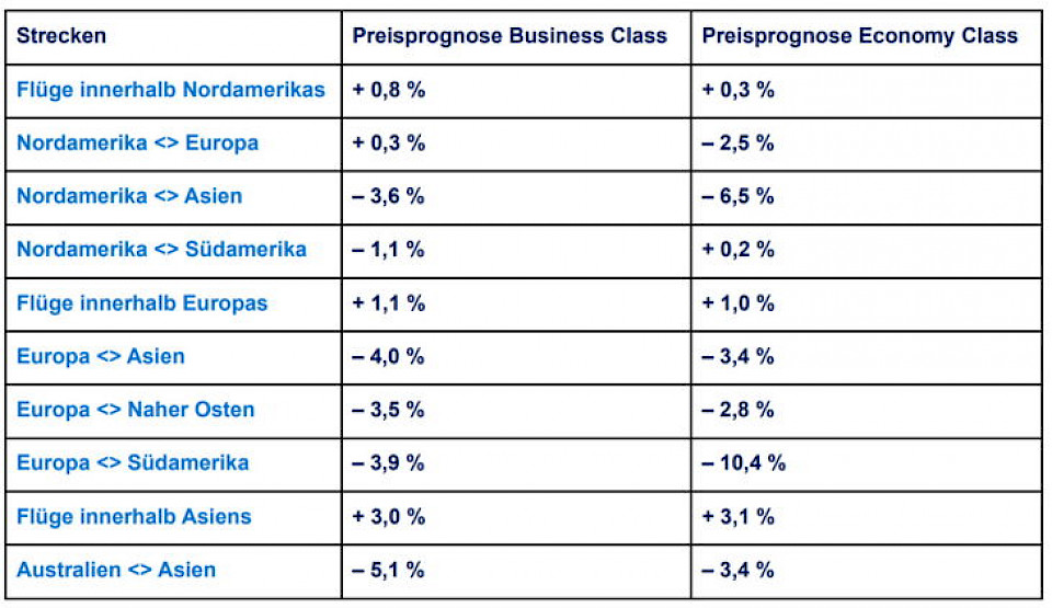 Die Flugpreise nach Asien werden 2024 voraussichtlich sinken. Für Flüge innerhalb Europas wird ein Anstieg von etwa einem Prozent prognostiziert, während die Preise zwischen Europa und dem Nahen Osten (minus 3,5 Prozent in der Business Class, minus 2,8 Prozent in der Economy Class) und Südamerika (minus 3,9 Prozent in der Business Class, minus 10,4 Prozent in der Economy Class) sinken werden. Allen Preisvergleichen liegen die Preise von 2023 zugrunde.