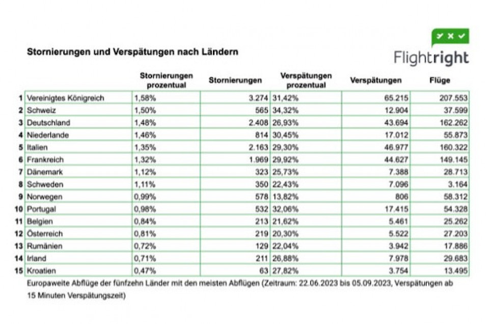 Analysten des Portals «Flightright» haben für den Zeitraum vom 22. Juni bis zum 5. September 2023 die Zahl der Annullationen und Flugverspätungen in Europa ermittelt. Die Ergebnisse stellen der Schweiz kein gutes Zeugnis aus. 1,5 Prozent der geplanten Flüge wurden annulliert. Nur Grossbritannien mit einem Anteil von 1,58 Prozent weist eine noch schlechtere Bilanz aus. Auf Platz 3 landet Deutschland. Dort wurden 1,48 Prozent der Flüge storniert.