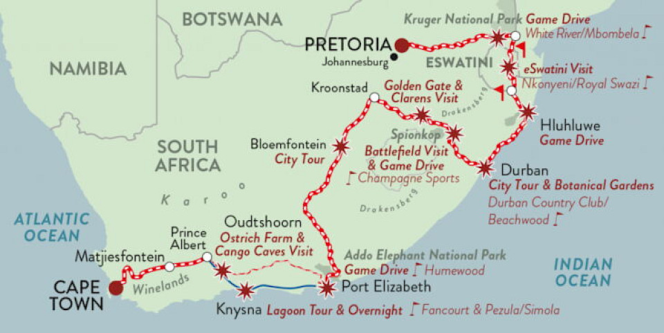 Auf dem Weg von Pretoria quer durch Südafrika bis Kapstadt werden die schönsten Plätze gespielt, kombiniert mit Safari und vielen weiteren Höhepunkten.