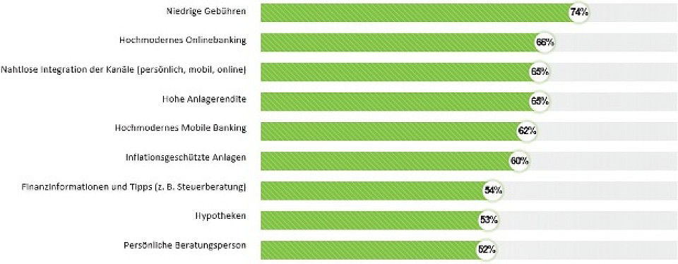 Für fast drei Viertel der Befragten sind niedrige Gebühren der entscheidende Punkt bei der Wahl einer Bank. Nahtlose und hochmoderne Bankdienstleistungen über alle Kanäle – wie Online-Banking, eine mobile Banking-App sind ein weiterer wichtiger Entscheidungsfaktor bei dieser Wahl. Interessanterweise ist die persönliche Beratungsperson nur bei gut 50 Prozent der Kundinnen und Kunden entscheidend.