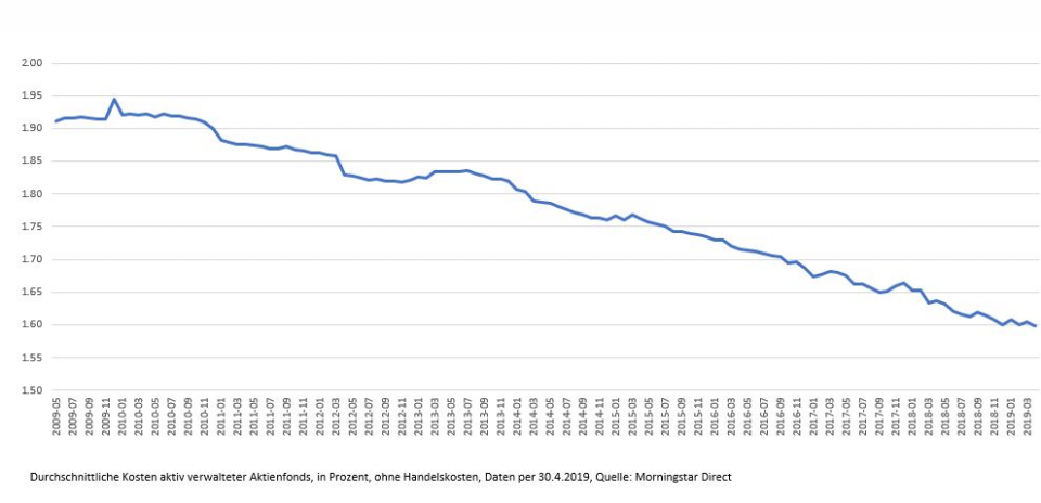 Aktiv verwaltete Aktienfonds sind in Europa seit der Finanzkrise deutlich günstiger geworden. Wie aus einer aktuellen Auswertung von Morningstar hervorgeht, sind die Fondsgebühren seit Mai 2009 von durchschnittlich 1,91 Prozent auf 1,60 Prozent zurückgegangen. Das entspricht einer Kostenreduktion um knapp 16 Prozent. Die Datenuntersuchung "Fondskosten ohne Transaktionskosten seit 2009" enthält wichtige Gebühren, die seit Inkrafttreten der EU-Richtlinie MiFid II von Fondsgesellschaften offengelegt werden müssen.