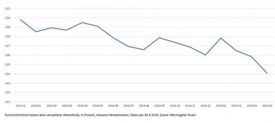 Die Kosten-Kurve von aktiv verwalteten Aktienfonds weist auch unter Einbeziehung der Handelskosten nach unten. Zwischen Ende Dezember 2017 und Ende April 2019 gingen die Fondskosten von total 1,90 Prozent auf inzwischen 1,84 Prozent zurück. Die Datenhistorie ist hier deutlich geringer als bei den Fondskosten ohne Transaktionsgebühren, da diese Daten von Fonds erst seit rund zwei Jahren erhoben werden und die Datenbasis erst seit Ende 2017 einigermassen befriedigend ist, wie Morningstar erläutert.