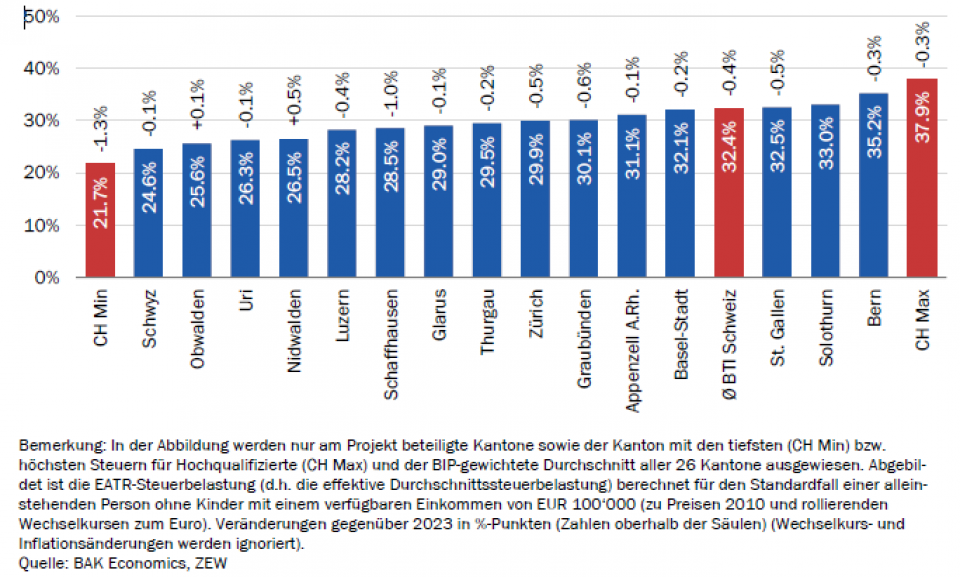 Schweizer Kantone kommen bezüglich Steuern gut weg. Sowohl bei den Unternehmen als auch bei den Hochqualifizierten liegt die Belastung deutlich unter dem internationalen Durchschnitt. Hochqualifizierte Arbeitnehmende profitieren 2024 sogar von Erleichterungen.