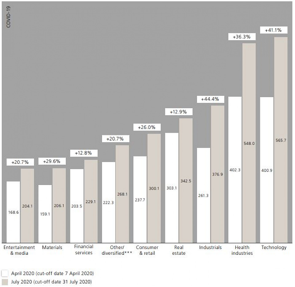2018, 2019 und in den ersten sieben Monaten dieses Jahres, hat das Vermögen der Technologie-Milliardäre um 42,5% auf 1,8 Bio. USD zugenommen. Die Superreichen im Gesundheitsbereich legten um 50,3% auf 658,6 Mrd. USD zu, angetrieben von einem Innovationsschub in der Medikamentenforschung, in der Diagnostik und der Medizinaltechnologie sowie selbstredend im Bereich der Covid-19-Behandlungen und -Ausrüstungen. Dieser Vermögenszuwachs ist verglichen mit dem durchschnittlichen Vermögenszuwachs der Milliardäre (19,1%) also mehr als doppelt so hoch.