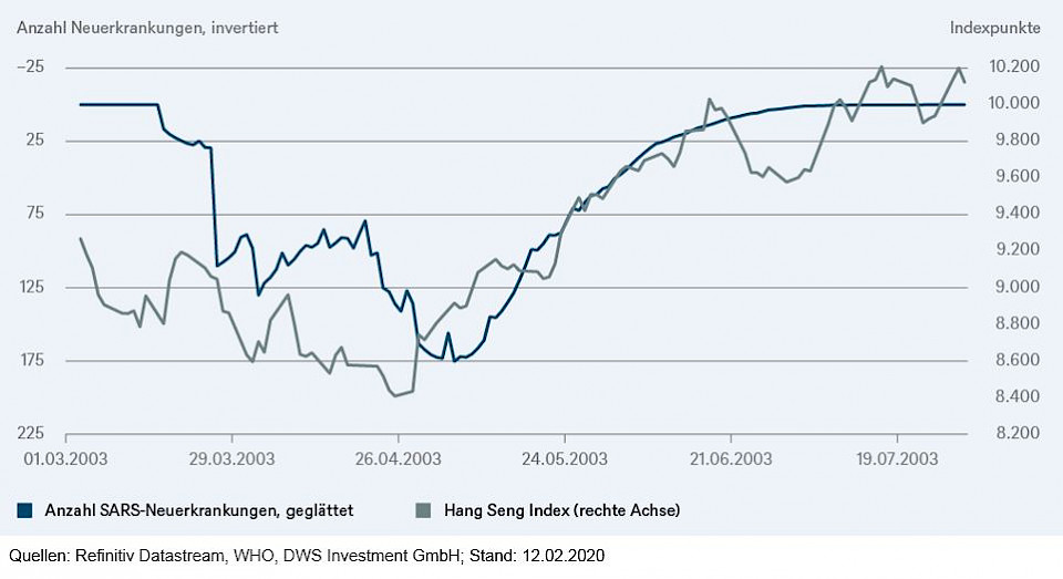 Und trotzdem steigen die Märkte. Um dieses Verhalten zu verstehen, könnte ein Blick auf die Erfahrung der SARS-Krise 2003 hilfreich sein. Wie aus dem DWS-"Chart der Woche" hervorgeht, fand der Hang Seng Index, der damals am nächsten am Epizentrum der Krankheit lag, seinen Tiefpunkt Ende April, also knapp vor dem Zeitpunkt, von dem aus die gemeldeten täglichen Neuinfektionen wieder zu sinken begannen. Ein Vergleich mit der aktuellen Coronavirus-Epidemie zeigt ein fast identisches Muster: Der Tiefpunkt bei vielen Indizes war Ende Januar, während die Anzahl der täglich gemeldeten Neuinfektionen am 5. Februar ihren bisherigen Höhepunkt erreichte. Die Märkte haben sich also fast genau nach dem Muster von 2003 verhalten.