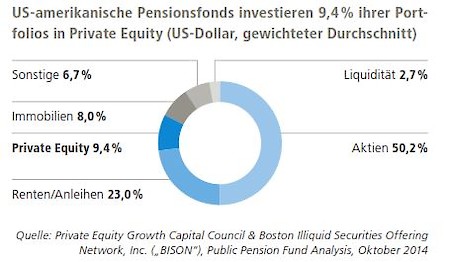 Invest- ments in Immobilien und Private Equity erhöht. Einer Untersuchung von über 150 US-amerikanischen Pensionsfonds zufolge, lag bei diesen Investoren die Allokation in Immobilien zuletzt bei durchschnittlich 8 % und in Private Equity sogar bei durchschnittlich 9,4 % des verwalteten Vermögens. Private Equity hat sich damit in den Portfolios US-amerikanischer Pensionsfonds als drittwichtigste Assetklasse hinter Aktien und Renten etabliert.