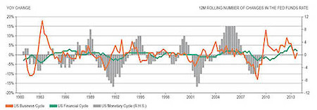 Abbildung 1: Drei Zyklen: Konjunktur, Finanzpolitik und Geldpolitik in den USA (1980 bis 2014)