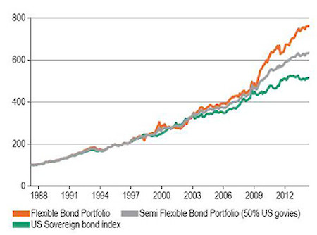 Dazu haben die Candriam-Analysten ein benchmarkfreies hypothetisches Portfolio zusammengestellt, das in vier Arten von US-Anleihen investieren kann: US-Staatsanleihen, Investmentgrade-Anleihen, High Yield-Anleihen und Wandelanleihen. Die Gewichtung unterliegt keinen Restriktionen. Dieses flexible Portfolio wird aktiv gemanagt und auf der Grundlage der Reaktionen der unterschiedlichen Asset-Klassen auf Konjunktur und Finanzen umgeschichtet. Langfristig entwickelte sich das benchmarkfreie Portfolio besser als ein reines US-Staatsanleihen-Portfolio.