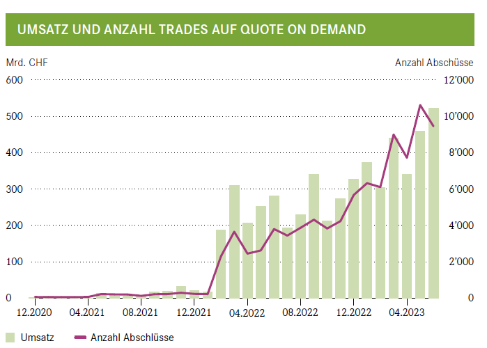 Das im Dezember 2020 an der Börse eingeführte «Quote on Demand» (QOD) hat sich nach anfänglich zögerlichem Start seit Februar 2022 dagegen prächtig entwickelt. Der monatliche Umsatz stieg seither kontinuierlich und erreichte im Juni mit 519 Mio. Franken den bislang höchsten Monatswert.