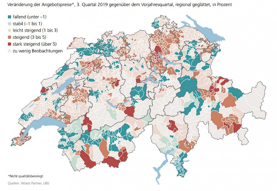 Der Schweizer Eigenheimmarkt verzeichnete im vergangenen Jahr den stärksten Preisanstieg seit 2014. Wohnungen und Häuser verteuerten sich gleichermassen um rund 2%, wie die aktuelle Immobilienmarktstudie des UBS Chief Investment Office Global Wealth Management (CIO GWM) zeigt. Haupttreiber dieser Entwicklung waren die im letzten Jahr auf ein neues Allzeittief gesunkenen Hypothekarzinsen. Insbesondere an teuren Zentrumslagen fallen sinkende Kapitalkosten mehr ins Gewicht als in der Peripherie. So stiegen die Preise für Wohneigentum am stärksten in den urbanen und wirtschaftsstarken Regionen wie rund um den Genfersee sowie in den Grossregionen Zürich und Basel. Im Luxussegment war die Preisentwicklung sogar dreimal so stark wie im Schweizer Durchschnitt.