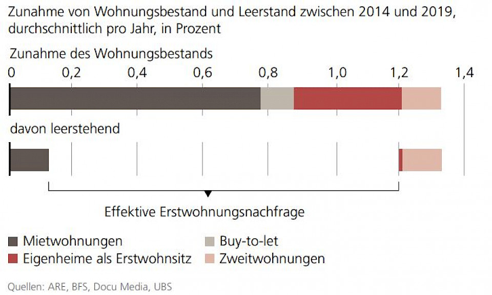 Knapp 70'000 Mietwohnungen bzw. 2,8% des Bestands dürften per Ende 2019 leer gestanden haben, was etwa einer Verdoppelung in den letzten fünf Jahren entspricht. Allerdings hat das Überangebot gemäss Studie das Interesse der Investoren bisher erst geringfügig reduziert. Letztes Jahr wurden mit rund 44 '00 Wohnungen zwar 14% weniger bewilligt als im Vorjahr, bei den Baugesuchen ist jedoch nur eine zögerliche Abnahme feststellbar.