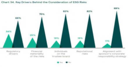 Mercers 2018 survey (See Chart) found that 34% of survey participants cited regulatory drivers as the key factor in encouraging them to consider ESG risks. Twenty-five percent of respondents cited the financial materiality of ESG risks. The views of individual trustees and reputational risks were both cited as drivers by 18% of respondents. Ten percent cited the need to align the investment strategy with their sponsors Corporate Social Responsibility Strategy.