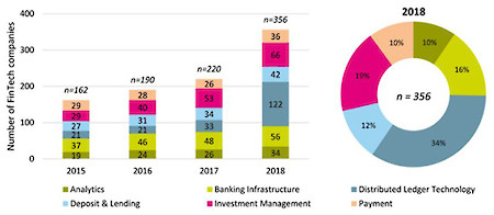 Weiter zeigt die Studie, dass globale Innovation die FinTech-Unternehmen vorantreibt. In den FinTech-Geschäftsbereichen lässt sich ein gewisses Muster erkennen: Die techgetriebenen FinTech-Unternehmen, namentlich in den Bereichen Distributed Ledger Technology (z.B. Blockchain) und Analytics, sind hauptsächlich international orientiert. Die finanzgetriebenen Unternehmen, etwa aus den Bereichen Deposit & Lending oder Payment, fokussieren sich hingegen verstärkt auf den Binnenmarkt. Dieses Muster lässt sich nicht nur bei den hiesigen, sondern auch bei den internationalen FinTech-Unternehmen erkennen.