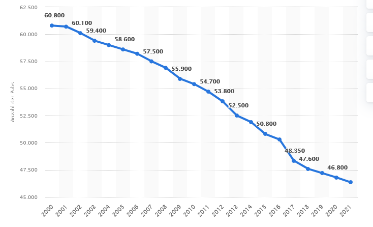 Laut der British Beer & Pub Association gab es im Jahr 2021 landesweit rund 46'350 Pubs. Im Jahr 2000 waren im Vereinigten Königreich noch rund 60'800 Pubs geöffnet. Die Zahl nimmt seit der Jahrtausendwende ab (vgl. Grafik), aber noch nie so rasch wie jetzt.