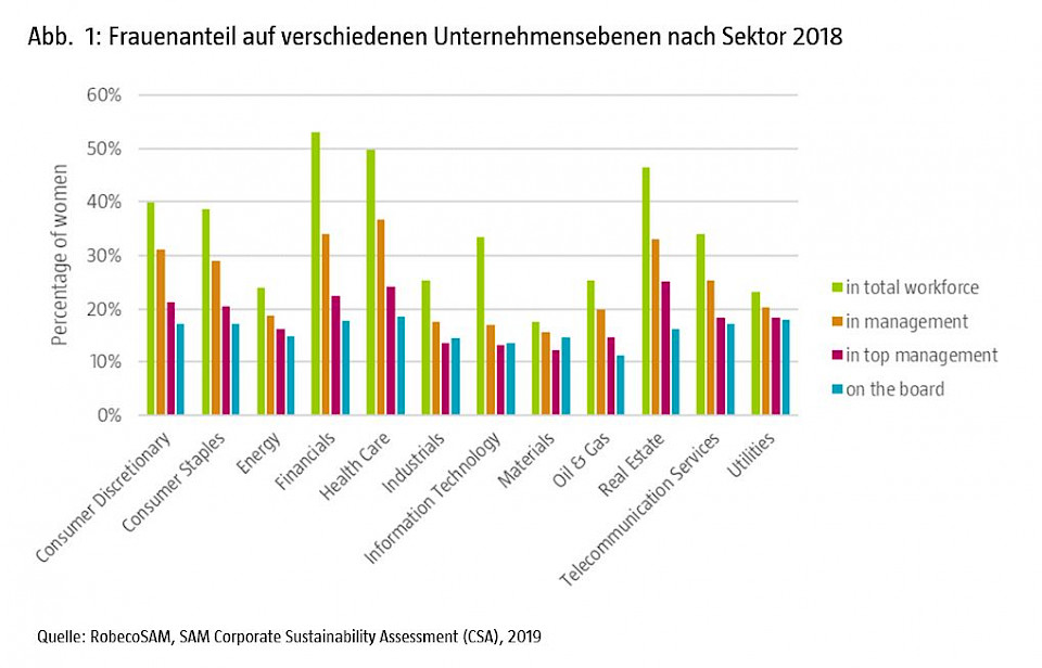 Eine Studie von RobecoSAM zeigt, dass nach wie vor ein erhebliches Gefälle zwischen dem Frauenanteil in der Unternehmensleitung und dem erheblich höheren Frauenanteil in der Gesamtbelegschaft besteht: Je höher die Unternehmensebene, desto geringer der Frauenanteil. Dabei performen laut der Studie Firmen mit einem höheren Frauenanteil im Kader besser.