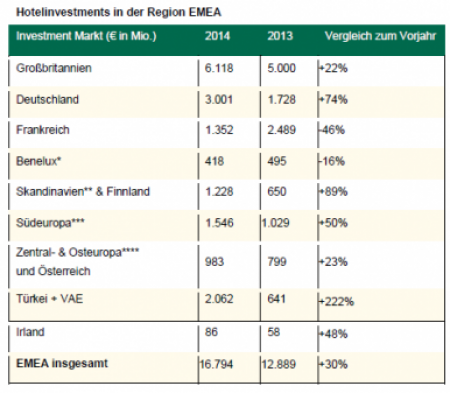 Das Investitionsvolumen auf dem Hotelmarkt in der Region EMEA (Europe, Middle East, Africa) belief sich im Jahr 2014 auf insgesamt rund 16,8 Milliarden Euro. Dies entspricht einem Anstieg um 30 Prozent gegenüber dem Vorjahr (2013: 12,9 Milliarden Euro) und spiegelt die zunehmende Stärke der Assetklasse Hotel wider. In nahezu allen europäischen Ländern lag das Investmentvolumen im Jahr 2014 signifikant über dem jeweiligen Vorjahreswert. Das stärkste Wachstum gegenüber 2013 verzeichneten dabei die skandinavischen Länder (plus 89 Prozent), Deutschland (plus 74 Prozent) und Südeuropa (plus 50 Prozent). Wie in den Vorjahren machten Großbritannien, Deutschland und Frankreich mit einem Anteil von insgesamt 62 Prozent das Gros des Transaktionsvolumens aus.