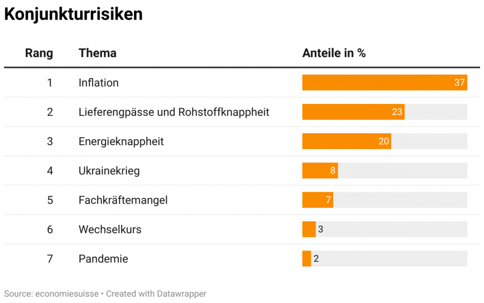 Economiesuisse weist darauf hin, dass diese Umfrageergebnisse eine Momentaufnahme sind und die grosse Unsicherheit der Unternehmen über den künftigen Konjunkturverlauf zeigen. Das Schadenspotenzial sei aber unterschiedlich. Während einzelne Risiken wie der Fachkräftemangel und Lieferengpässe die Konjunktur bremsten, könnten andere diese völlig abwürgen: Eine Energiemangellage im kommenden Winter oder eine Eskalation des Ukraine-Krieges hätte schockartige, negative Auswirkungen mit rezessiven Folgen für die Schweizer Wirtschaft. Die vorliegende Konjunkturprognose gehe nur von bremsenden, nicht aber von schockartigen Entwicklungen aus.