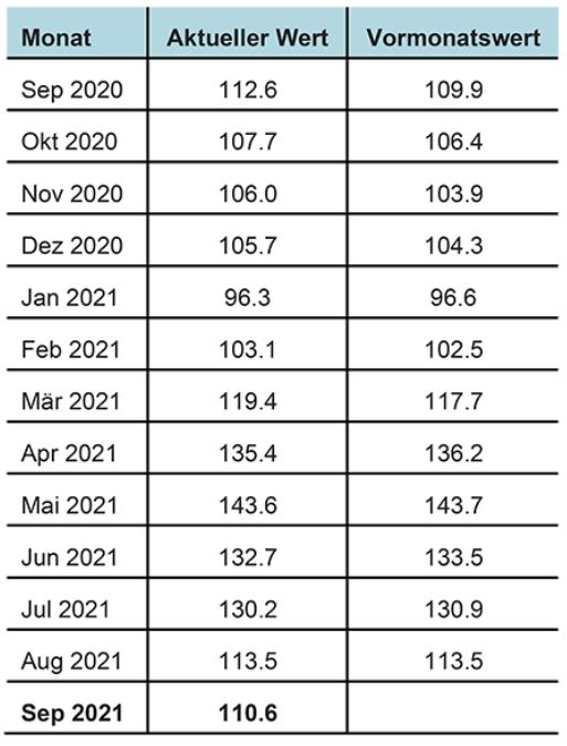 Das KOF-Konjunkturbarometer steht im September bei 110,6 Punkten und damit 2,9 Punkte niedriger als noch im August. Die Erholung der Schweizer Konjunktur von der Pandemie verlangsame sich somit zwar etwas, dürfte sich jedoch in den kommenden Monaten fortsetzen, so die Konjunkturforschungsstelle KOF der ETH Zürich. Der erneute Rückgang sei in erster Linie auf Indikatorenbündel der Auslandsnachfrage zurückzuführen. Ein zusätzliches negatives Signal senden Indikatoren des Verarbeitenden Gewerbes gefolgt von Indikatoren des Wirtschaftsbereichs übrige Dienstleitungen. Leichte positive Impulse senden hingegen Indikatoren der Finanz- und Versicherungsbranche.
