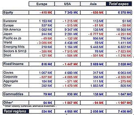 An den Obligationenmärkten liessen Anleger im Oktober Vorsicht walten. Gefragt waren in erster Linie Staatspapiere (+1,1 Milliarden Euro) und hier vor allem kurz laufenden Anleihen. Abflüsse mussten hingegen Unternehmenspapiere (-827 Millionen Euro) - vor allem Unternehmensanleihen aus der Eurozone (-929 Millionen Euro) - verzeichnen. Darüber hinaus schichteten Anleger Mittel in ETFs auf globale Bonds sowie auf US- und Eurozonen High-Yield-Märkte um.