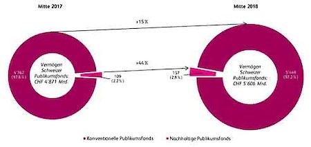 Gemäss Studie stehen heute Schweizer Anlegern von den 8'788 Publikumsfonds mit Schweizer Vertriebszulassung per 30. Juni 2018 423 Fonds (Vorjahr 336) Investmentfonds zur Verfügung, die neben finanziellen Kriterien auch ökologische, soziale oder Governance-spezifische Faktoren berücksichtigen. Die darin verwalteten Vermögen sind von 109 auf 157 Milliarden Franken gewachsen (+44 Prozent).