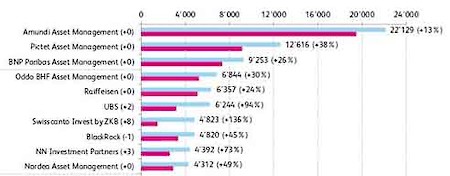 Speziell Pictet AM, Raiffeisen und Swisscanto Invest differenzieren sich traditionsgemäss mit entsprechenden Anlagen und werden von Branchenexperten als "Vorreiter" auf dem Gebiet nachhaltiger Anlagen bezeichnet. Die verwalteten Volumina bei Pictet Asset Management stammen mehrheitlich aus der Vielzahl der verschiedenen nachhaltigen Themenfonds sie machen fast 95 Prozent der nachhaltigen Vermögen aus. Raiffeisen positioniert sich mit ihren "Futura"-Nachhaltigkeitsfonds schon seit 2001 ebenfalls mit Themenfonds. Auch Swisscanto Invest bietet seit langem ein breites Nachhaltigkeits-Offering im Anlage- und Vorsorgegeschäft in der Schweiz an. Die UBS positionierte sich bisher vor allem mit nachhaltigen Passivprodukten im Markt für nachhaltige Publikumsfonds und ist in diesem Bereich die zweitgrösste Anbieterin in der Schweiz. Sie hat ihre ESG-Produktpalette aber jüngst erweitert und tritt verstärkt als Anbieterin nachhaltiger Kapitalanlagen auf.
