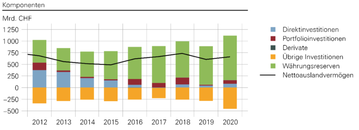 Das Nettoauslandvermögen sank gegenüber dem Vorquartal um 8 Mrd. auf 662 Mrd. CHF, weil der Bestand der Passiven stärker stieg als der Bestand der Aktiven. Die Aktiven nahmen im vierten Quartal 2020 um 51 Mrd. auf 5323 Mrd. CHF zu, die Passiven um 59 Mrd. auf 4661 Mrd. CHF. Der Anstieg der Bestände war auf beiden Seiten auf die gleichen Faktoren zurückzuführen: Während der gegenüber dem Franken schwächere Wechselkurs des US-Dollars zu Bewertungsverlusten führte, sorgten die höheren Kurse an den Börsen im In- und Ausland für preisbedingte Bewertungsgewinne.