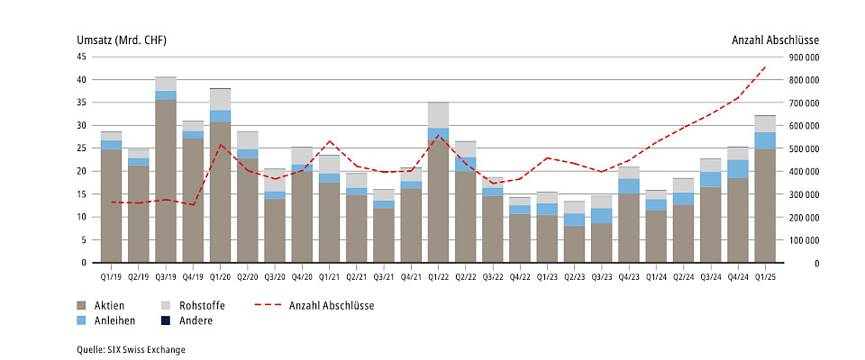 Das Angebot neu kotierter ETFs an SIX Swiss Exchange stieg im 1. Quartal um 65 Einheiten und damit um acht Einheiten mehr als im Vorquartal. Am 31. März belief sich die Gesamtzahl der an SIX Swiss Exchange kotierten ETFs auf 1 930 Einheiten. Das entsprach einem Plus von 45 gegenüber dem 4. Quartal 2024.