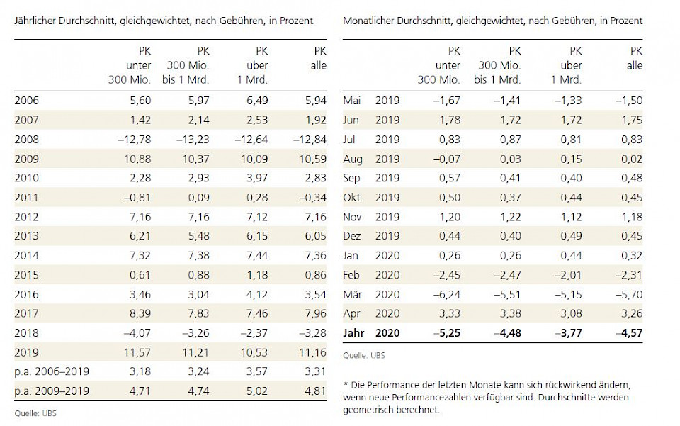 Die durchschnittliche Monatsperformance der Pensionskassen im UBS-Sample betrug im April 3,26% nach Gebühren. Die grossen Pensionskassen mit verwalteten Vermögen über 1 Mrd. Franken schnitten mit 3,08% am schlechtesten ab. Die mittleren Pensionskassen mit verwalteten Vermögen von 300 Mio. bis 1 Mrd. Franken erzielten das beste Ergebnis mit 3,38%, dicht gefolgt von den kleineren Vorsorgeeinrichtungen (bis zu CHF 300 Mio.) mit 3,33%.