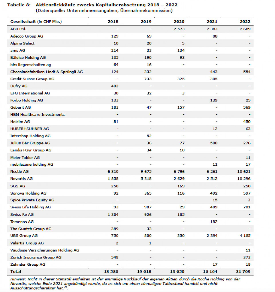Laut der Studie stiegen die Dividenden der SPI-Firmen im vergangenen Jahr um 2 Milliarden auf 52,6 Milliarden Franken an. Deutlich schneller wachsen die Rückkäufe von eigenen Aktien. Waren es 2021 gut 16 Milliarden, hat sich das Volumen im vergangenen Jahr fast verdoppelt. Hauptgrund waren die je mehr als 10 Milliarden Franken, welche Nestlé und Novartis investierten, um das Kapital herabzusetzen. «Erstmals wurden insgesamt über 80 Milliarden Franken an die Aktionärinnen und Aktionäre ausgeschüttet», schreiben die Autoren. Der Anteil der Aktienrückkäufe an den gesamten Ausschüttungen betrug im Jahr 2022 beinahe 40 Prozent. So hoch war dieser in den letzten Jahren nie gewesen.