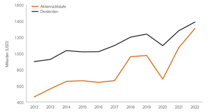Laut dem Janus Henderson Global Dividend Index stiegen die Aktienrückkäufe 2022 um 22 Prozent auf einen Rekordwert von 1,31 Billionen US-Dollar. Innerhalb von 10 Jahren haben sie sich fast verdreifacht, die Dividenden sind insgesamt um 54 Prozent gestiegen.