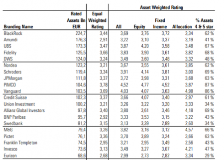 Unter den grössten 20 Anbietern belegte DWS Rang vier nach Rang fünf per Ende September und tauschte damit mit Fidelity die Plätze. Die Publikumsfonds (ex ETFs) von Vanguard brachten es auf 104 Milliarden Euro nach 106 Milliarden Euro per Ende des Vorquartals. Diese relativ stabile Entwicklung hatte einen Sprung von Platz zwölf auf Rang zehn des Rankings zur Folge. Die grösste Veränderung unter den Top 20 ergab sich bei Invesco: das US-Haus belegte per Ende 2018 Rang 19 nach Rang 15 per Ende September. Das Vermögen mit Sterne-Ratings sank deutlich, und zwar von 96 Milliarden Euro auf 74 Milliarden Euro.