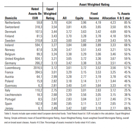 Die Niederlande hatten auch per Ende Dezember 2018 die besten Fonds in Europa. Fonds mit Domizil Niederlanden kommen auf ein Sterne-Rating von durchschnittlich 3,70 Sternen nach 3,68 Sternen per Ende September. Auf Platz zwei folgt die Schweiz mit durchschnittlich 3,54 Sternen nach 3,46 Sternen. In beiden Ländern sind Vertriebsmodelle, denen Kickbacks zugrunde liegen, auf dem Rückzug.